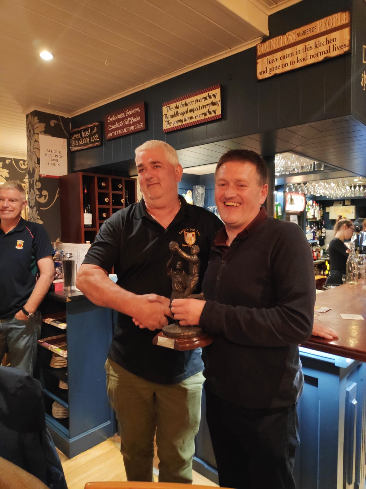 Kieran Cawley (left) accepts his Hall of Fame award from Ballinrobe GAA Club Chairman, Declan Corcoran, at a special function held in Carney’s Bar and Restaurant, Ballinrobe.
